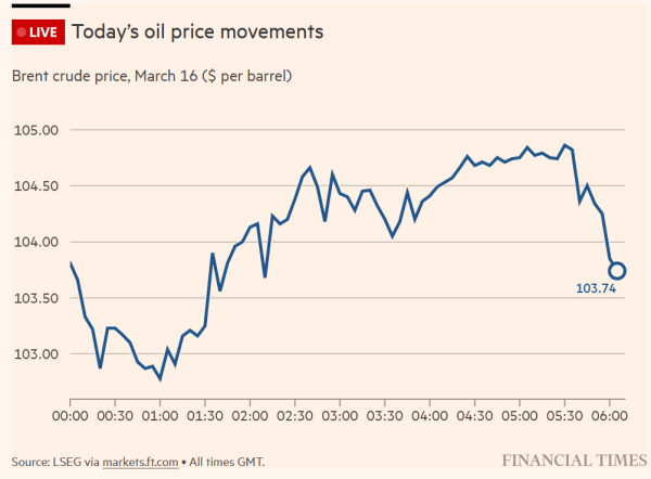 英国《金融时报》报道,3月16日(ri),布伦特原油一度冲高(gao)至每桶106.50美元,随后回落至104.75美元。