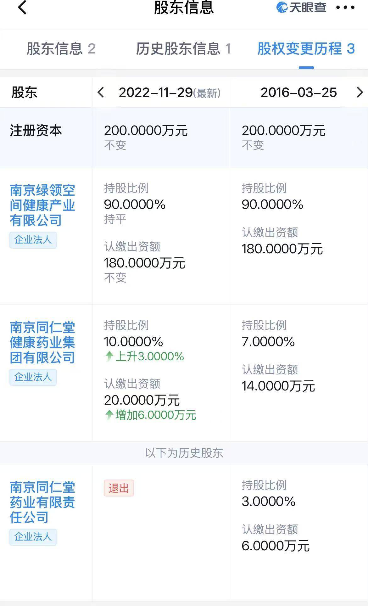 从股权结构看,该公(gong)司由南(nan)京(jing)绿(lu)领空间健康产业有限公(gong)司和南(nan)京(jing)同仁堂(tang)健康药业集团有限公(gong)司共同持股。值得(de)注意的是,上述公(gong)司的历史(shi)股东为(wei)南(nan)京(jing)同仁堂(tang)药业有限责(ze)任公(gong)司,认缴出资(zi)日期为(wei)2012年,并(bing)于2022年11月(yue)29日退(tui)出。