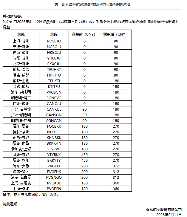 春秋航空(kong)于3月11日宣布,自2026年3月12日凌晨零时(以订单日期为准)起,调整部分国际航线旅客运输燃油附加征收标准,主要涉及(ji)中国内地多座城市往返韩国、日本、越(yue)南、泰国、马来西亚、柬埔(pu)寨的(de)航线。