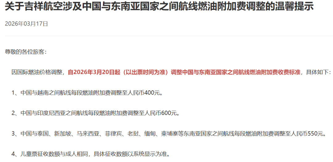 吉(ji)祥(xiang)航空(kong)3月17日公告称,因国际燃油价格调整,自2026年3月20日起(以出票时间为准)调整中国与东(dong)南亚国家(jia)之间航线燃油附加费收费标准,具体为: