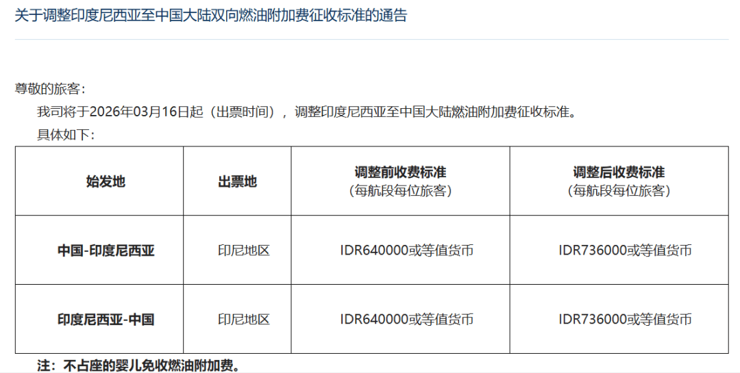 3月17日,厦门(men)航空(kong)宣布于2026年03月16日起(出票时间),调整印度尼西亚至(zhi)中国大(da)陆燃油附加费征收标准:每航段每位旅客收费从IDR(印度尼西亚盾(dun))64万(约近260元(yuan)人民币)增(zeng)至(zhi)IDR 73.6万(298.5元(yuan)人民币)。