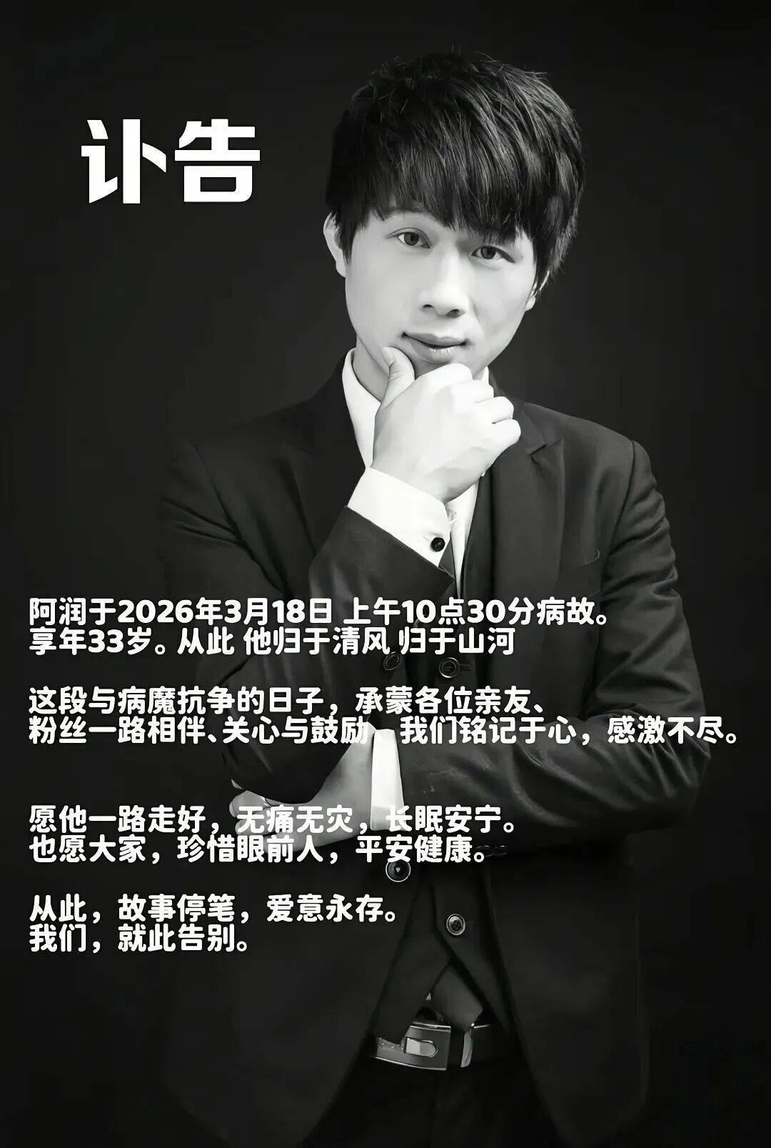 3月18日,33岁抗癌(ai)博主“润哥”去世。家人在社交平台发布讣告: